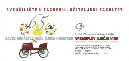 Vremeplov dječje igre“ – dokumentarna izložba igračaka, plakata i publikacija povodom 65 godina Saveza društava Naša djeca Hrvatske putuje dalje. U suradnji s Učiteljskim fakultetom Sveučilišta u Zagrebu u utorak, 8. prosinca 2015. godine s početkom u 19,00 sati u Galeriji Učiteljskog fakulteta (Savska cesta 77, Zagreb) bit će otvorenje…...