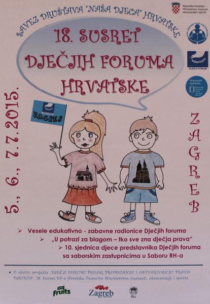 U Zagrebu će se 5., 6. i 7. srpnja 2015. godine održati 18. susret Dječjih foruma Hrvatske na kojem će sudjelovati djeca i voditelji iz 12 Dječjih foruma iz cijele Hrvatske. Po programu susreta djeca će sudjelovati u veselim edukativnim radionicama Dječjih foruma, tražit će blago i sudjelovati na zajedničkoj…...