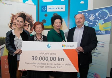 Tvrtka Microsoft Hrvatska u petak (03.04.) je Savezu društava Naša djeca Hrvatske predala donaciju od 30.000 kuna prikupljenih u akciji „Najveći selfie u Hrvatskoj“, namijenjenih opremanju kutka za roditelje Klinike za pedijatriju Rebro KBC-a Zagreb. Ivan Vidaković, direktor Microsofta Hrvatska predao je donaciju Sonji Borovčak, dopredsjednici Saveza društava Naša djeca…...