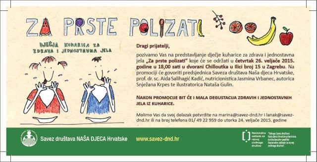 Savez društava Naša djeca Hrvatske je u okviru svojih aktivnosti na području prevencije pretilosti u djece te promociji zdravlja i zdravih stilova života objavio ilustriranu dječju kuharicu „Za prste polizati“. Kuharica će potaknut djecu da samostalno ili uz pomoć odraslih nauče pripremati zdrava i jednostavna jela. Kuharica „Za prste polizati“…...