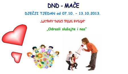Pod sloganom „Ljubav djeci prije svega!“ u općini Mače od 7. do 13. listopada 2013. obilježen je Dječji tjedan. U ovom tradicionalnom događanju sudjelovali su: Općina Mače, DND Mače, OŠ Mače, Područna škola Peršaves, KUD Lj. Gaj Mače, Igraonica DND-a i Radio Zlatar. U ponedjeljak su djeca oformila krug prijateljstva…...