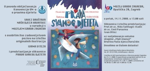 Savez društava Naša djeca Hrvatske organizira niz događanja u povodu obilježavanja Dana Konvencije UN-a o pravima djeteta 20. studenog. Započinjemo s predstavljanjem slikovnice Prava svakog djeteta teksta dr.sc. Emila Paravine, uz popratnu izložbu originalnih ilustracija iz te slikovnice, autora Ivana Viteza. U slikovnici su crtežom prikazana i tekstom opisana prava svakog…...